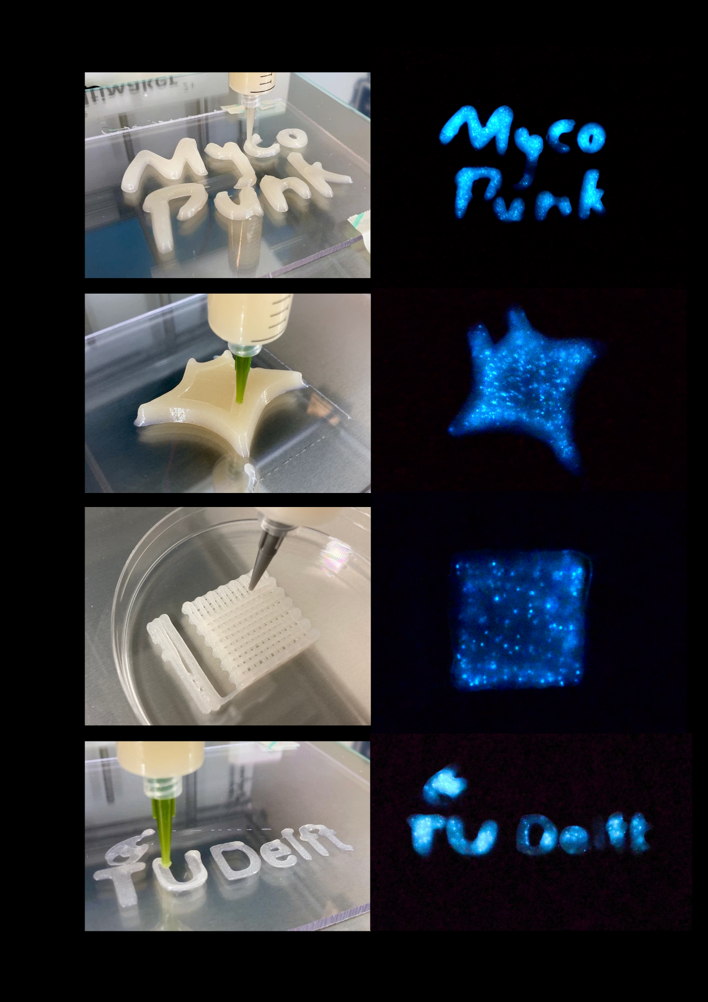 These living hydrogels were also 3D printed into various geometries, which also exhibited a strong bioluminescent response to touch. Inspired by the bountiful oceans we were surrounded by in our lab, I chose to print shapes of gliding manta rays, corals, and turtles. Some of them can be seen below.